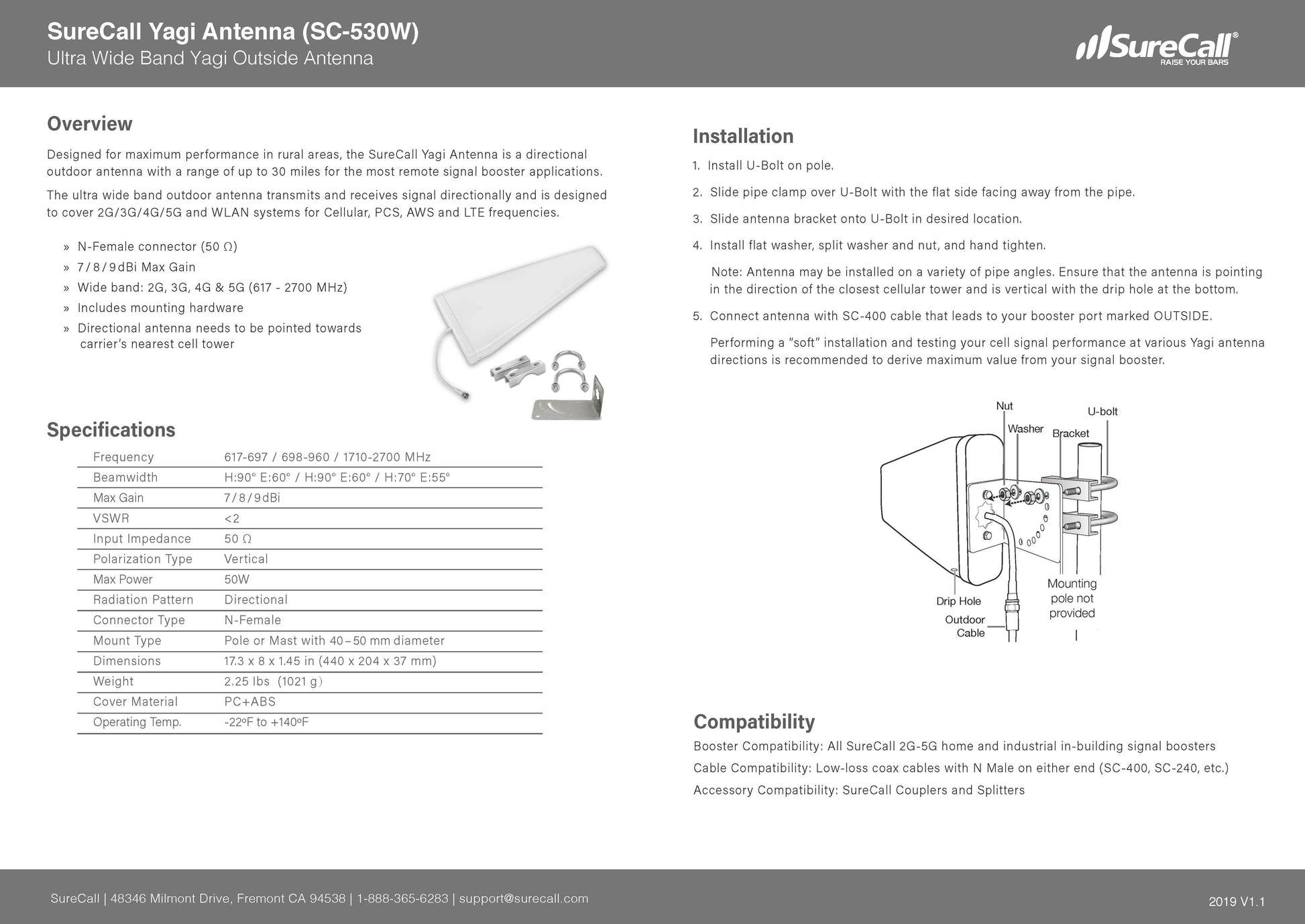 Designed for maximum performance in rural areas, the SureCall Yagi Antenna is a directional outdoor antenna with a range of up to 30 miles for the most remote signal booster applications. The ultra-wideband outdoor antenna transmits and receives signal directionally and is designed to cover 2G/3G/4G/5G and WLAN systems for Cellular, PCS, AWS and LTE frequencies.