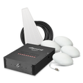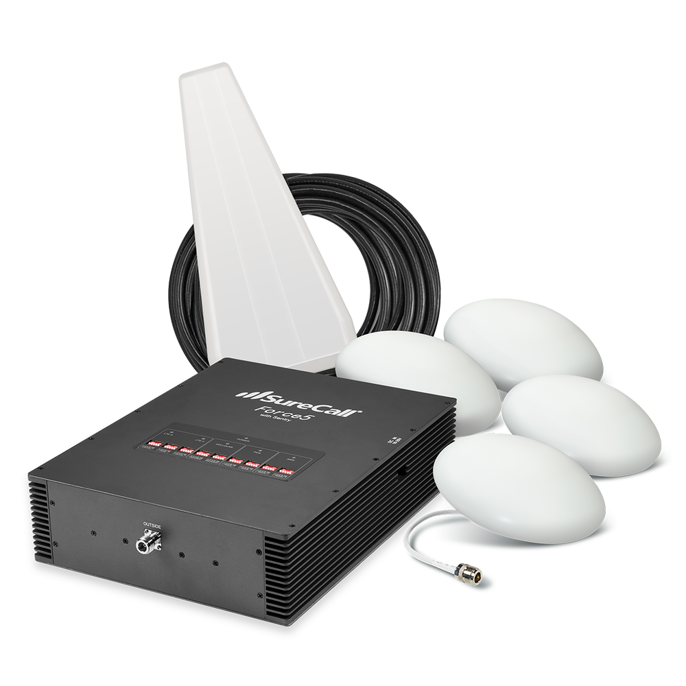 SureCall Force5 2.0 cell phone signal booster kit, with Sentry Remote Monitoring built-in, increases cellular coverage for areas 25,000+ sq. ft. for all carriers voice, text and 4G LTE data signals. Kit includes 30 ft. and five 75 ft. lengths of SureCall 400 low loss coax cable, 4-way splitter, outdoor Yagi antenna and four indoor Ultra Thin dome antennas.