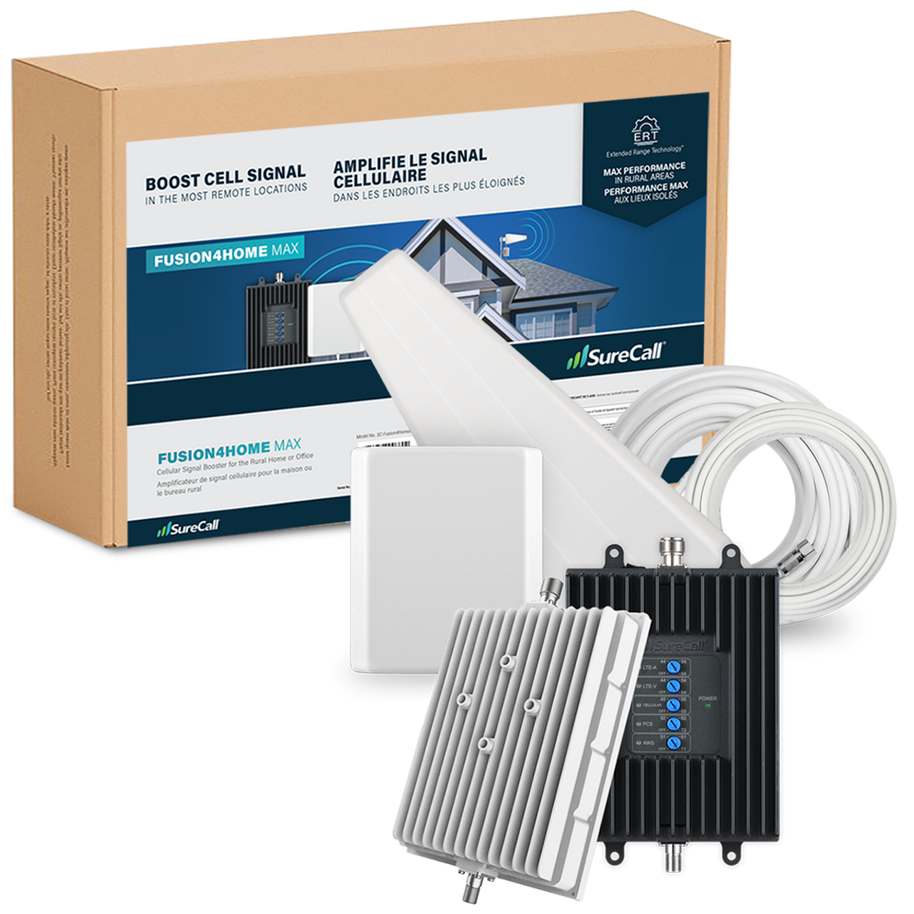 Fusion4Home Max boosts voice, text and data signals for all North American carriers simultaneously including Verizon, AT&T and T-Mobile to deliver enhanced coverage inside of homes up to 6,500 sq. ft. Designed, assembled and tested in the USA with outstanding build quality, award-winning technologies, all-carrier compatibility, and world-class support, Fusion4Home Max is the premier booster kit for rural and suburban homes. Kit includes: Fusion4Home Max outside booster, outdoor Yagi antenna, indoor host unit, indoor panel antenna, 75 ft of RG-6 cable and 20 ft of SC-240 cable.