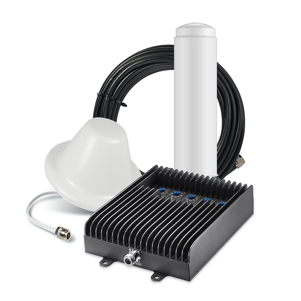 SureCall Fusion5S cell phone signal booster kit increases cellular coverage up to 6,000 sq. ft. for all carriers voice, text and 4G LTE data signals. Kit includes 30 ft. and 75 ft. of SureCall 400 low loss coax cable, outdoor Omni antenna, and indoor dome antenna.