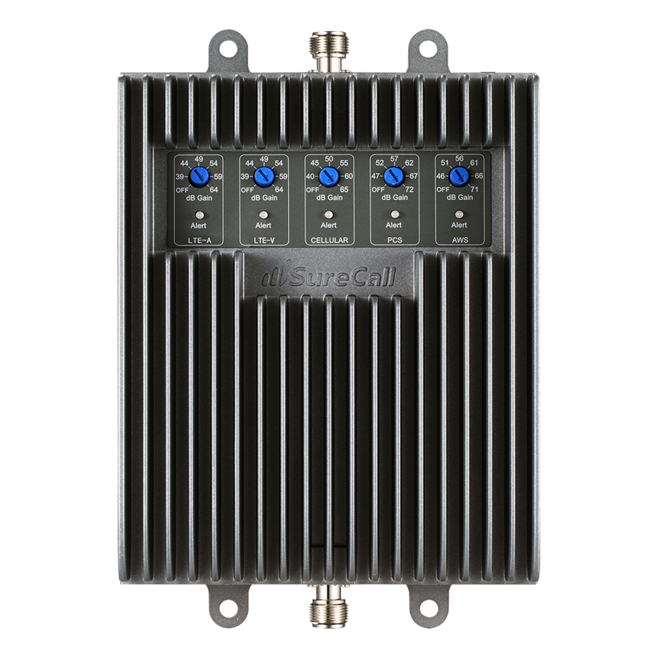 SureCall Fusion5s cell phone signal booster kit increases cellular coverage up to 10,000 sq. ft. for all carriers voice, text, 4G LTE and 5G data signals. Kit includes 30 ft. and 75 ft. of SureCall 400 low loss coax cable, outdoor Yagi antenna, and indoor dome antenna.