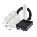 SureCall Fusion5X 2.0 Omni / 4 Dome cell phone signal booster kit includes a Fusion5X 2.0 amplifier with +16 dBm downlink power, five 75 ft. lengths of SureCall low loss SC-400 coax cables, 4-way splitter with connecting cable, outdoor omni antenna and four indoor dome antennas.