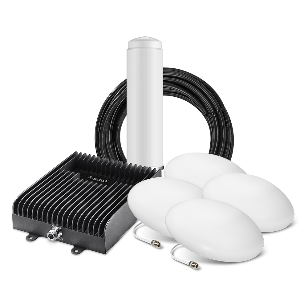SureCall Fusion5X 2.0 Omni / 4 Ultra-Thin cell phone signal boosters. Kit includes Fusion5X 2.0 amplifier with +16 dBm downlink power, 75 ft. and 100 ft. lengths of SureCall low loss SC-400 coax cables, outdoor Omni antenna and four Ultra Thin dome antennas.