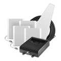 SureCall Fusion5X 2.0 Yagi / 4 Panel cell phone signal booster kit includes a Fusion5X 2.0 amplifier with +16 dBm downlink power, five 75 ft. lengths of SureCall low loss SC-400 coax cables, 4-way splitter with connecting cable, outdoor Yagi antenna and four indoor panel antennas.