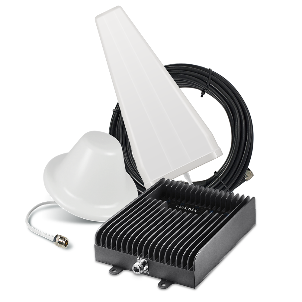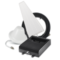 SureCall Fusion5X 2.0 Yagi / Dome cell phone signal booster kit includes a Fusion5X 2.0 amplifier with +16 dBm downlink power, 75 ft. and 100 ft. lengths of SureCall low loss SC-400 coax cables, outdoor Yagi antenna and indoor dome antenna.