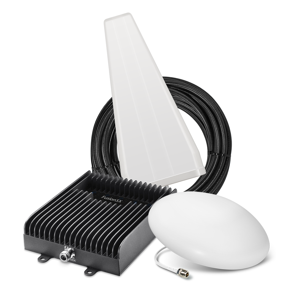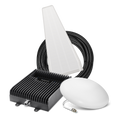 SureCall Fusion5X 2.0 Yagi / Ultra Thin cell phone signal booster kit includes a Fusion5X 2.0 amplifier with +16 dBm downlink power, 75 ft. and 100 ft. lengths of SureCall low loss SC-400 coax cables, outdoor Yagi antenna and indoor Ultra Thin dome antenna.